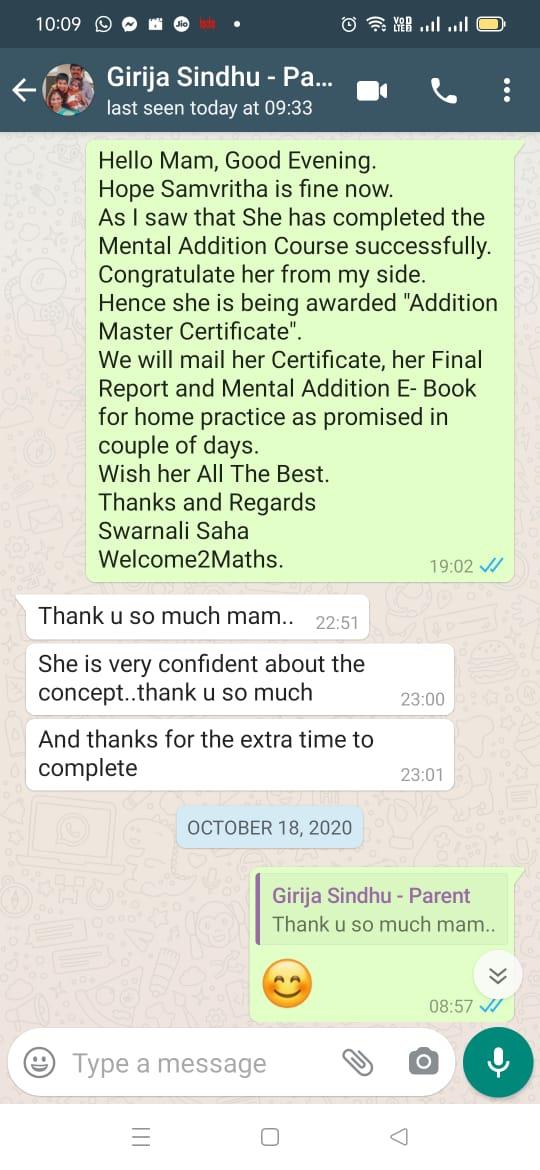 What an amazing course! Honestly, I have seen many online and offline courses on math calculation, be it Vedic Maths or Abacus, and have taken quite a few for my 11 year old son, but yours is the best. He is a fan of yours Swarnali Mam! The way you guided in the course was amazing. Now he is able to do his calculations within seconds. And not only that, his overall confidence in Math has also increased. Thanks to you Mam and thanks to the whole Welcome2Maths team.